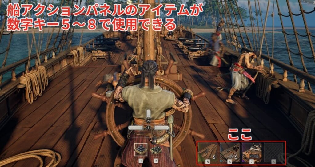 船アクションパネルにセットしたアイテムを数字キー5~8で使用できます。