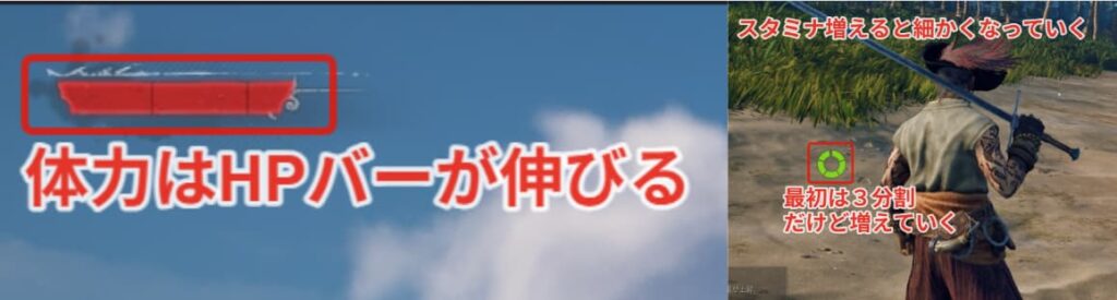 生命力に振ると体力バーが伸び、持久力に振ればスタミナのゲージが細かく分割されていきます。