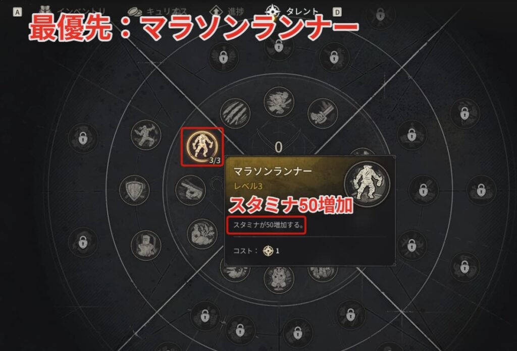 タレント取得は最優先で左のツリーにある【マラソンランナー】をレベル3に上げましょう。