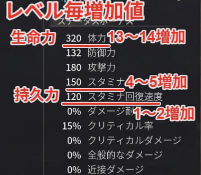 1レベル上がるごとに生命力は体力が13~14、持久力はスタミナが4~5、回復速度が1~2増加します。