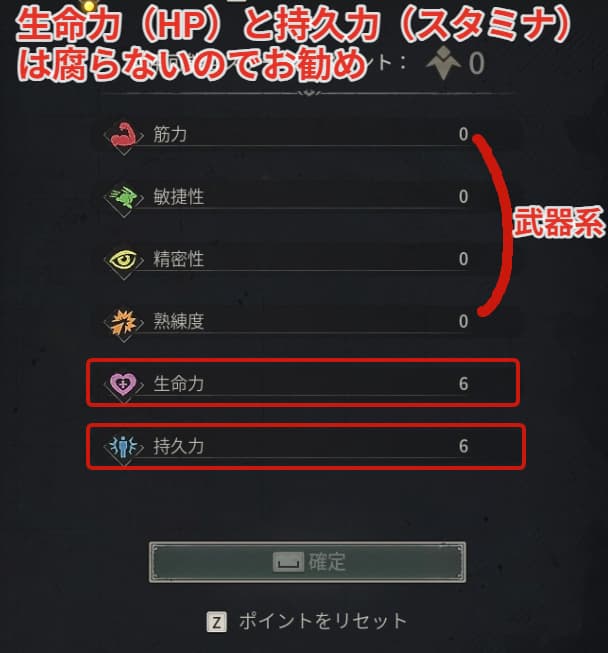 ステータスの割り振りは生命力(HP)と持久力(スタミナ)に振るのがお勧めです。