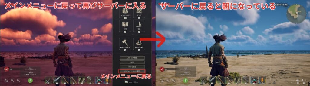 もう1つの方法はメインメニューに戻ると再びサーバーに入った際に朝になっています。