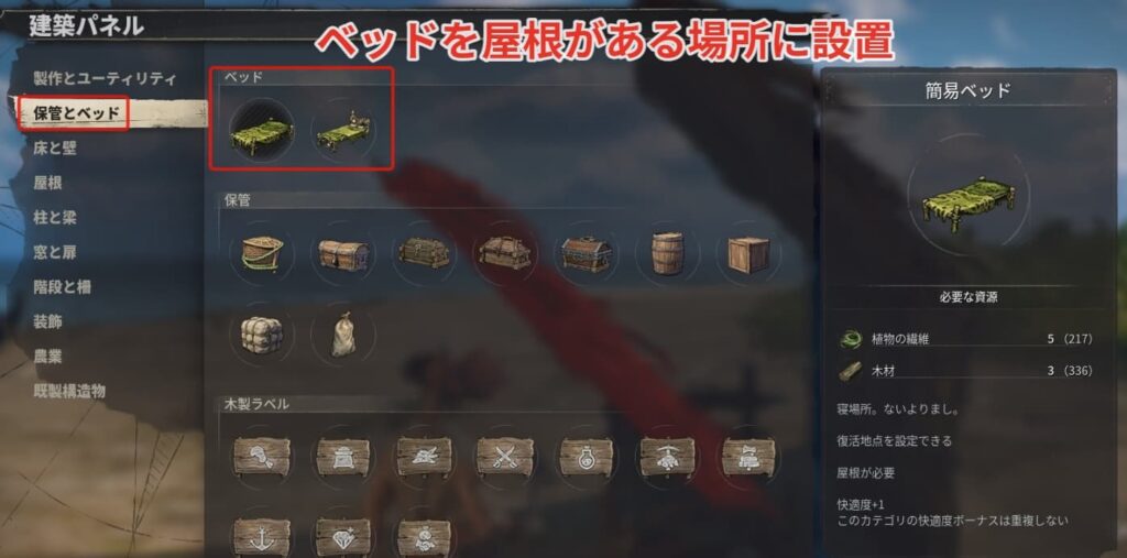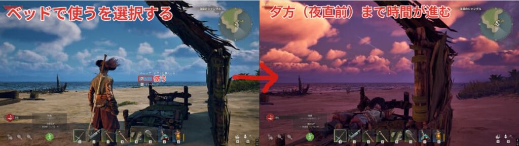 時間を進めるには建築からベッドを屋根がある場所に設置しましょう。