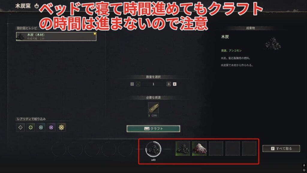 時間スキップの注意点として、ベッドで時間進めても窯や炉のクラフトは全く進みません。