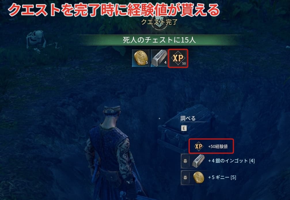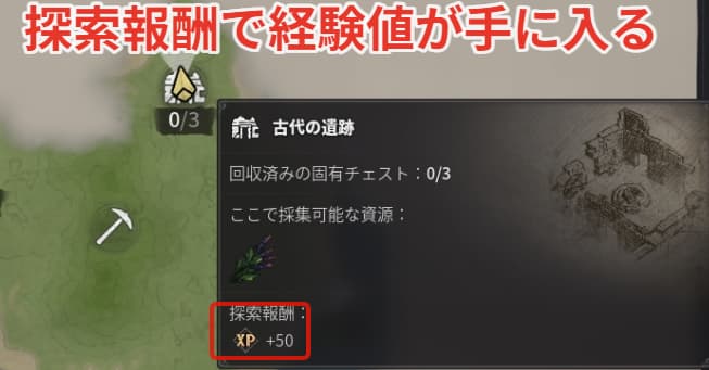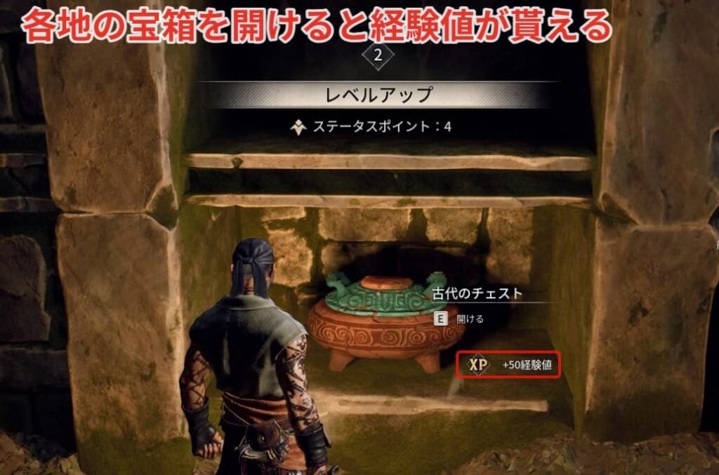 各地の固有チェスト(宝箱)を開けると経験値が手に入ります。